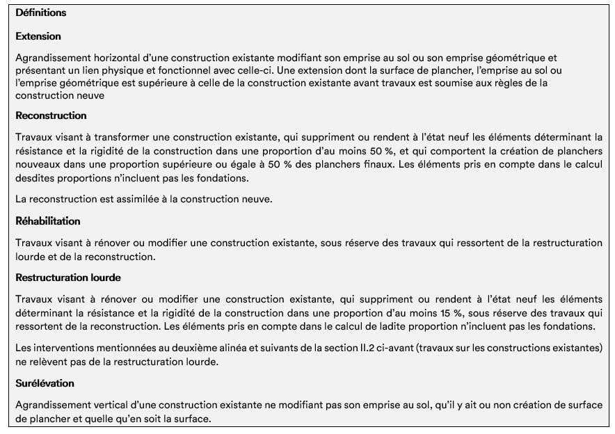 - aux constructions neuves et aux interventions suivantes sur les constructions existantes : restructurations lourdes, extensions, surélévations, changements de destination. En revanche, les réhabilitations ou les interventions plus limitées sur des immeubles existants n’entrent pas dans le champ de ce dispositif (par exemple les réalisations d’ascenseurs ou travaux dans les parties communes, ravalements, extensions de moins de 500 m² SDP, etc.) ;